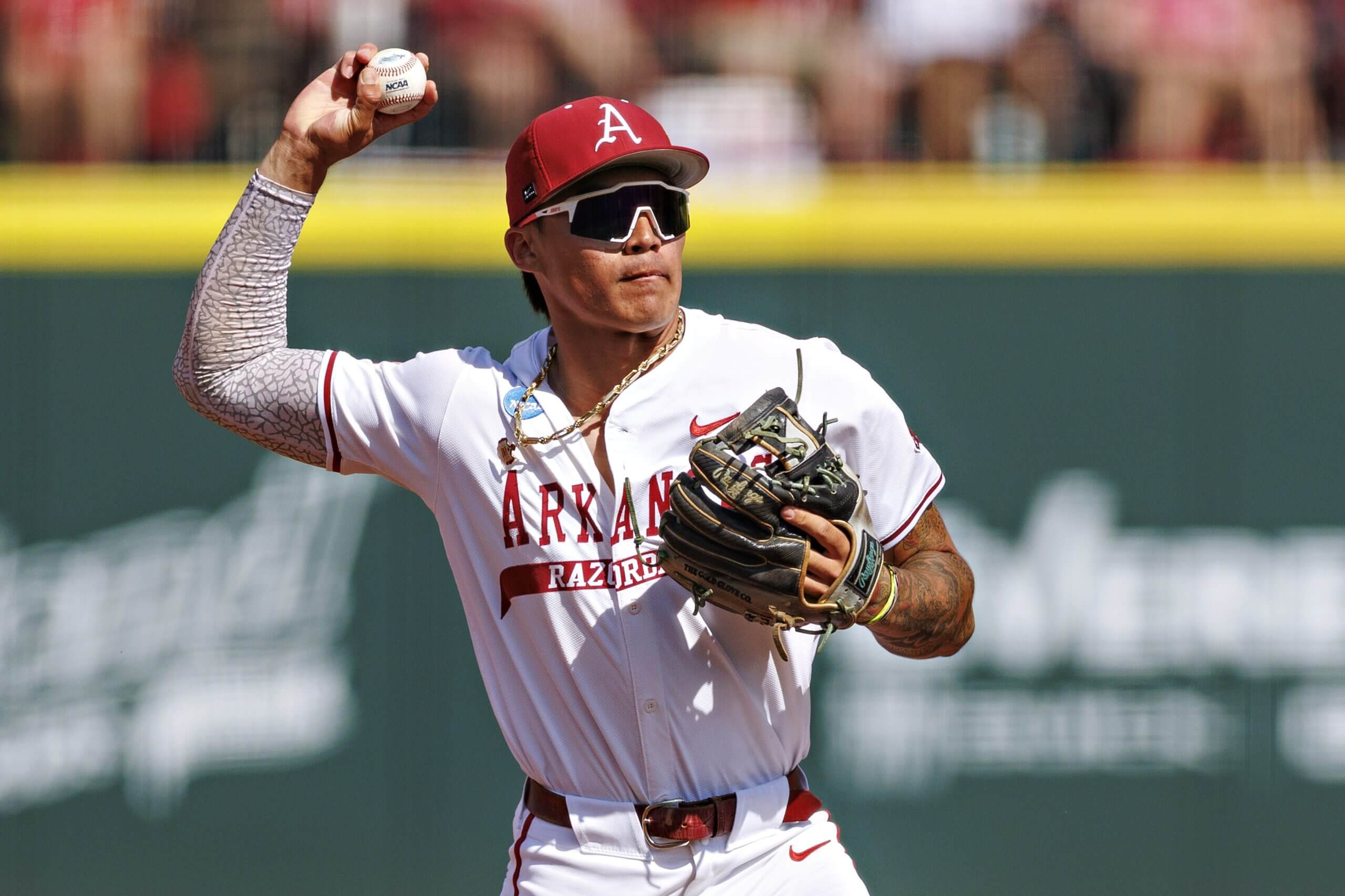 Aloy is a true shortstop with power, showing plus defense as an amateur with good lateral range and plenty of arm for the left side of the infield, while he led a loaded Razorbacks lineup with 21 homers and a .673 slugging percentage. Baltimore took him with their second selection, pick No. 31, as part of a very strong day-one draft class that included Ike Irish and two of the players they just traded to acquire Shane Baz. Aloy has the hard-contact data that many teams seek in the draft, with a 54 percent hard-hit rate with Arkansas, thanks to great bat speed and hand strength. He does have trouble with breaking stuff and generally with swinging at pitches beyond the strike zone. He’s got a big leg kick and gets his front foot down somewhat late, which might be contributing to some of his timing issues, although I think there’s some pitch recognition issues mixed in as well. His future is going to come down to the choices he makes at the plate; he would have gone in the first round proper had he shown better swing decisions, but model-heavy teams rated him lower than that primarily because his swing decisions were a net negative. He has 20-plus homer upside in a shortstop who should be at least a 55 defender — or a 60-plus if he ends up at third base — with his ultimate value coming down to whether he can pick up spin and cut down on the chase.