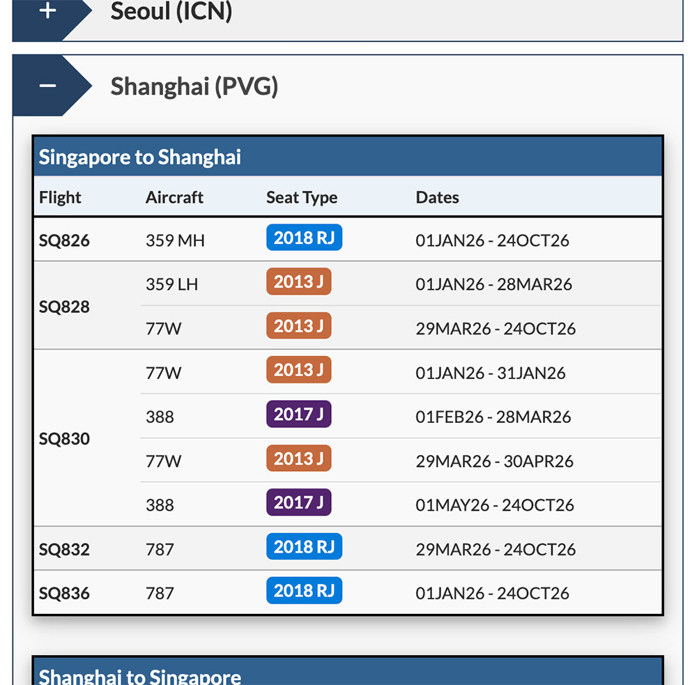 We have an equivalent guide showing where the First Class seat and Suite types are flying around the SIA network, through to October 2026.