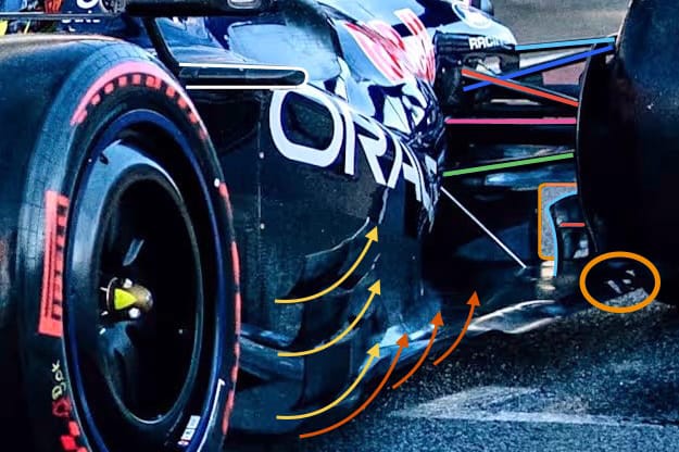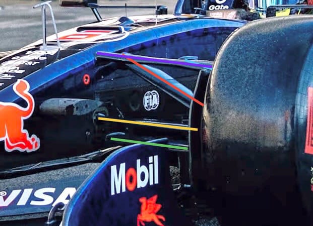 It may be that Red Bull doesn’t have a side in the diffuser in that area going rearwards and so is then using the turning vane further outboard (light blue highlight line) to help pull airflow through the diffuser by connecting what we call the ‘tyre squirt’ airflow that is created by the tyre rotating onto the track surface.