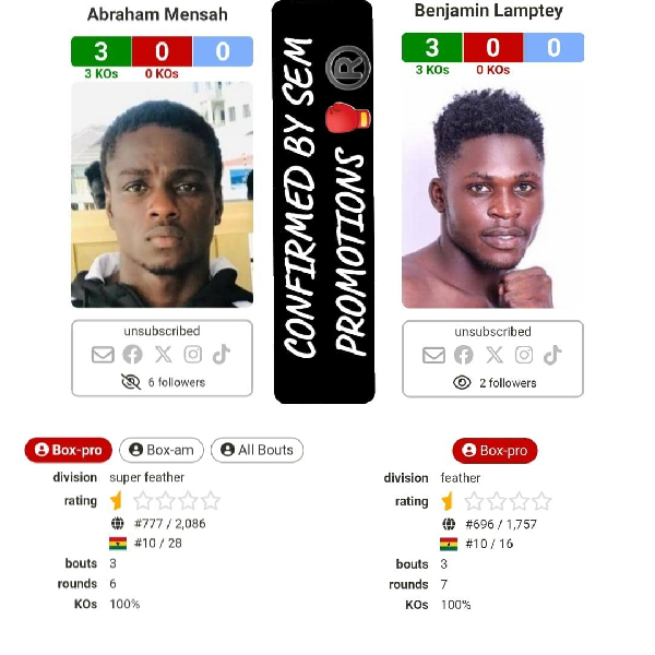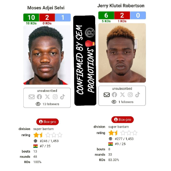 Meanwhile, Michael Adjei Selvi (10-2-1) is set to face Jerry Klutei Robertson (6-2-0) in a Super Bantamweight clash.