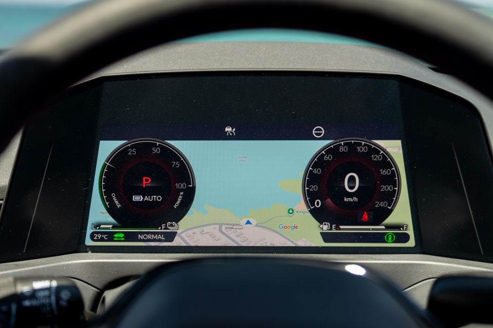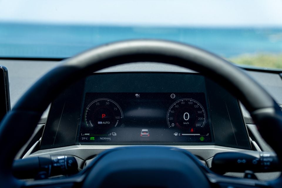 As you’d expect, the instrument cluster displays all relevant driving information in clearly defined graphical elements, including road speed and engine revs in conventional dials, fuel and battery level indicators in bar graphs, and numerical readouts for ambient temperature and the odometer.