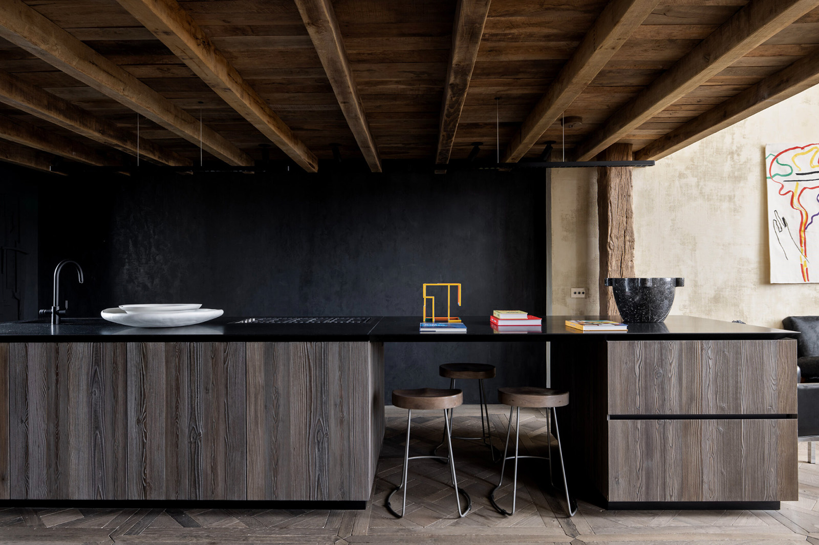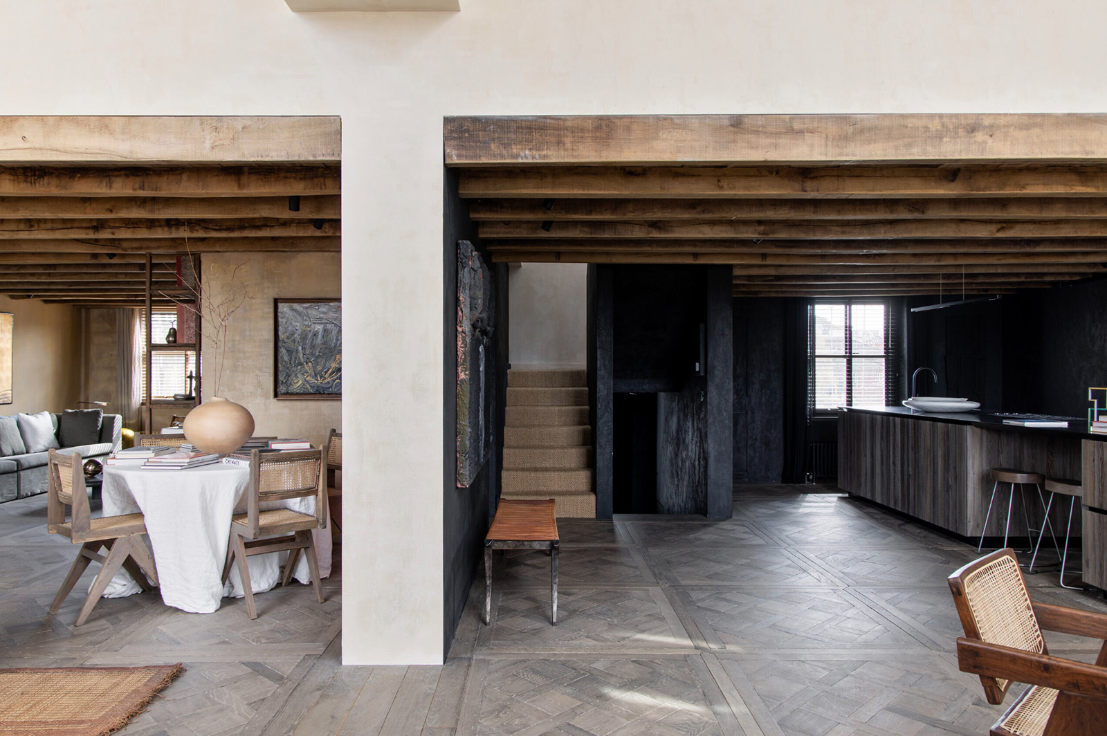 Vaulted ceilings and low-slung beams give the 2,042sqft plan a near-civic scale, softened by yellow-toned lime plaster and inky black walls. The main reception level wraps around the volume in a horseshoe arrangement, creating a sequence of interconnected rooms. Light enters through double-height windows that rise into the eaves, washing across a kitchen anchored by a monolithic marble and timber Boffi island. Elsewhere, Parquet de Versailles flooring sourced from Belgium and matt-black Dornbracht fittings bring tactility and weight.