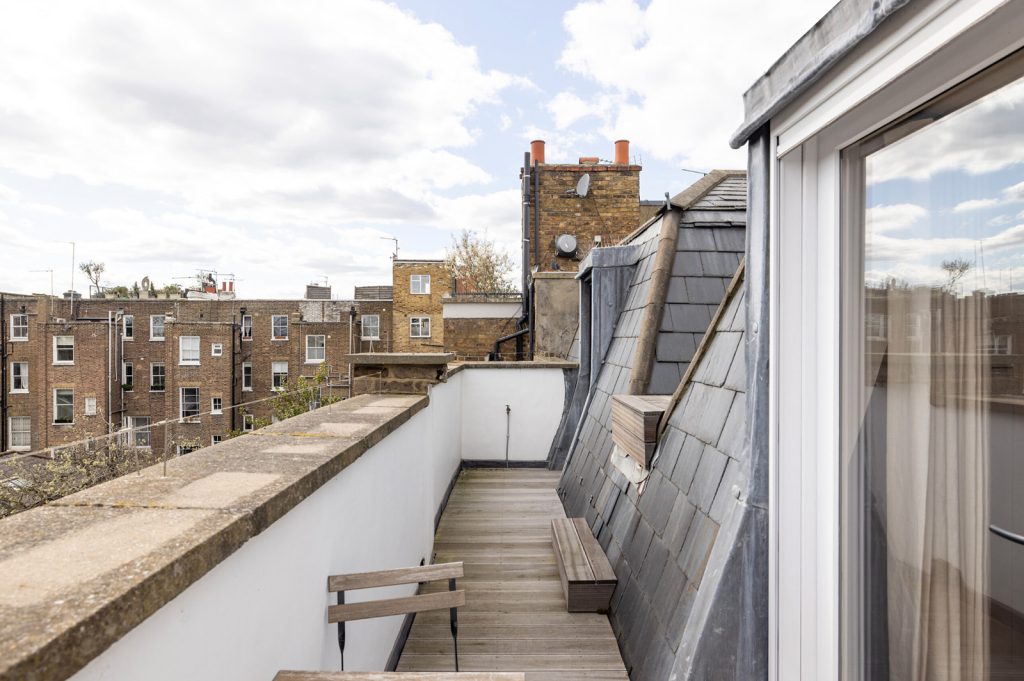 Two calm bedrooms sit apart from the main living spaces, each with an en suite bathroom and access to a private terrace overlooking the Notting Hill roofscape. The principal suite pairs a vaulted ceiling with a skylit bathroom, while the guest room introduces fitted storage and a hessian carpet. The apartment is available for long or short let, priced from £6,000 per week through Domus Nova.