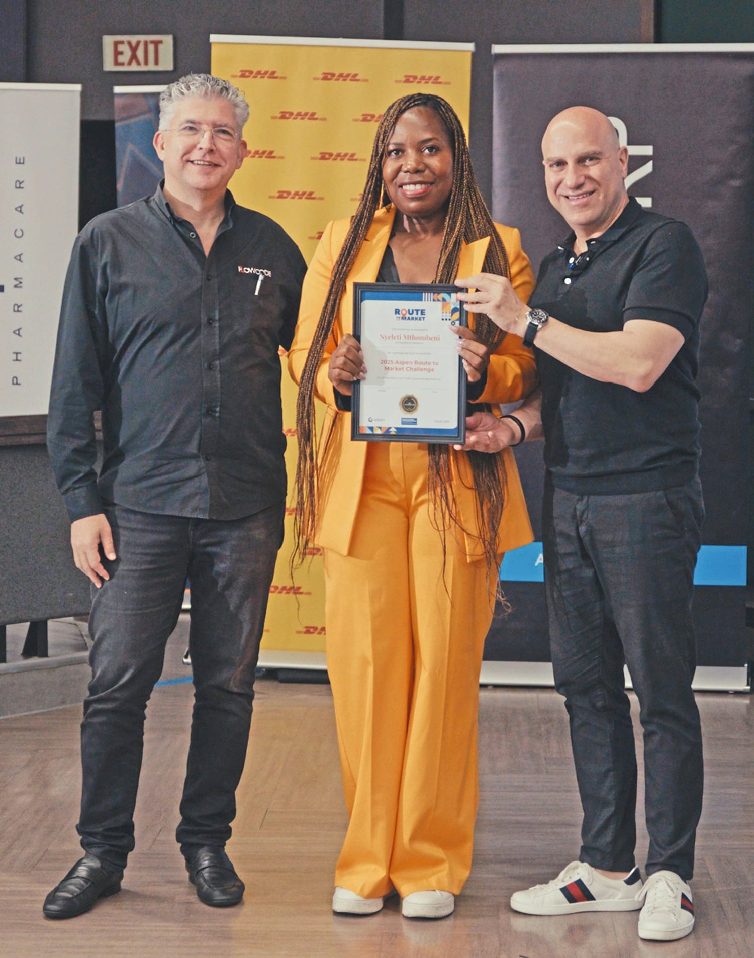 Nyeleti Mthombeni was a runner-up in the health category of the RTM Challenge 2025. She is flanked by Raizcorp’s Allon Raiz and Aspen Pharmacare’s Stavros Nicolaou (Supplied )