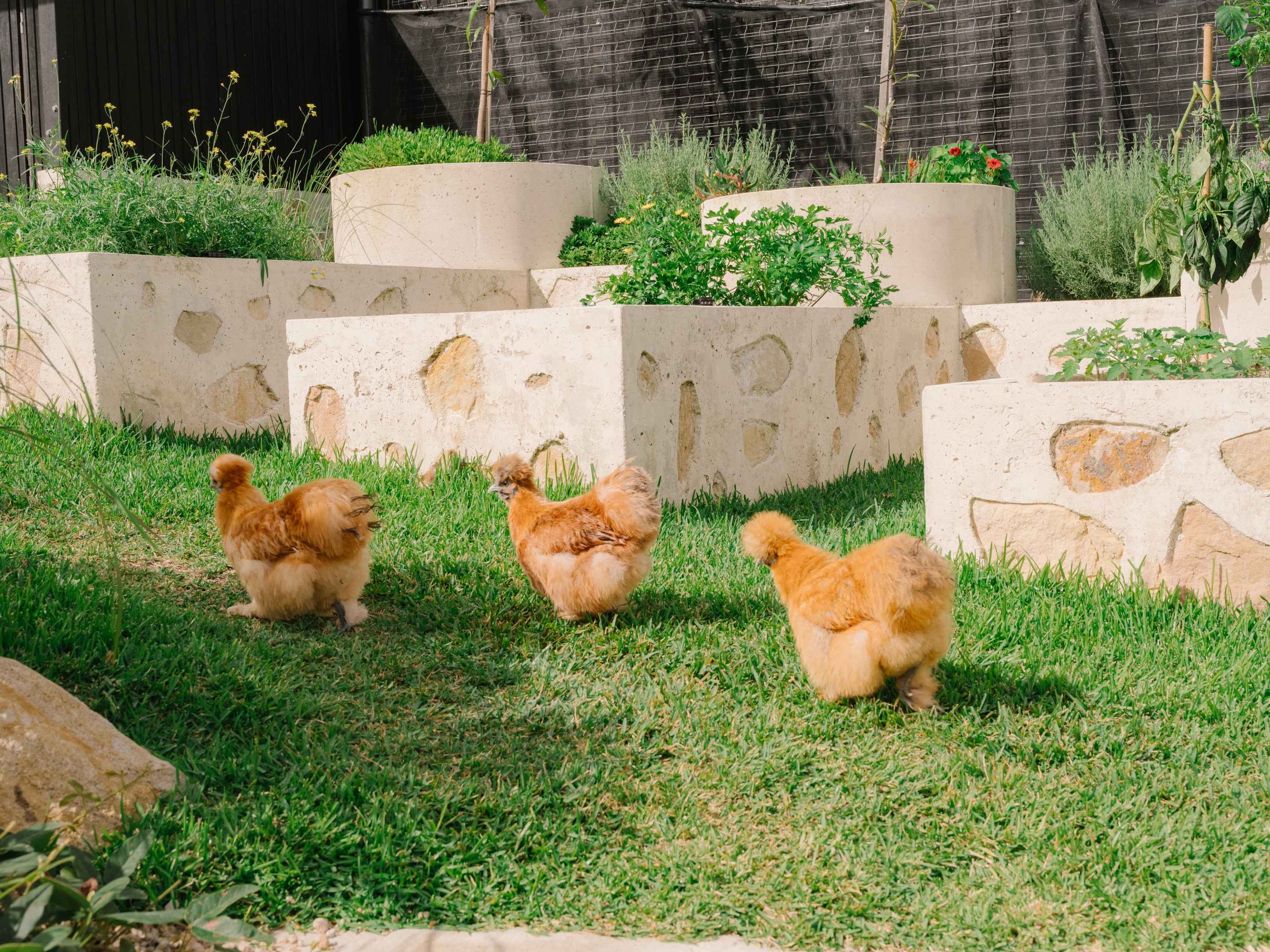 The landscaping draws from local coastal ecology to support bandicoot preservation, with native plants like coastal heath species sourced locally. We incorporated a productive fruit and vegetable garden, herb beds and a chicken coop for self-sufficiency. The canopy has over 20 floating planters growing a forest-like veil that will eventually drape down.