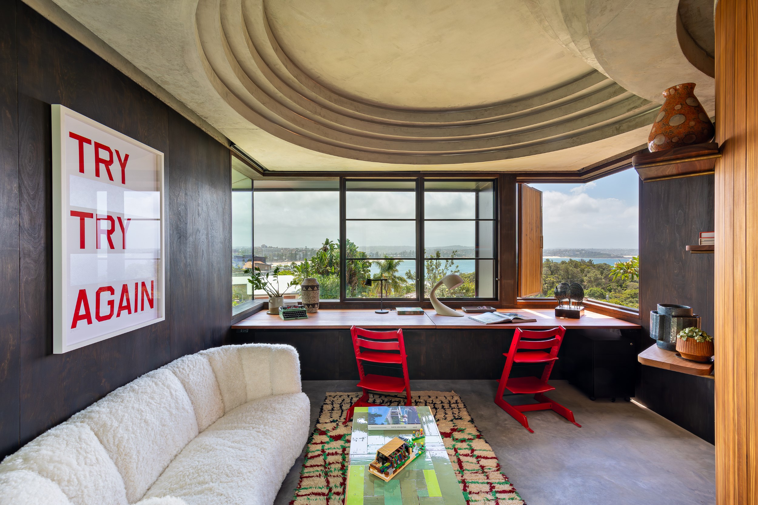 The stained glass patchwork panels deconstruct the Shelly Beach views, challenging the typical reverence for ocean panoramas by breaking them into colourful abstractions. This invites a fresh perspective, where ephemeral reflections of sunlight dance and play… especially on grey days or with winter’s softer sun.