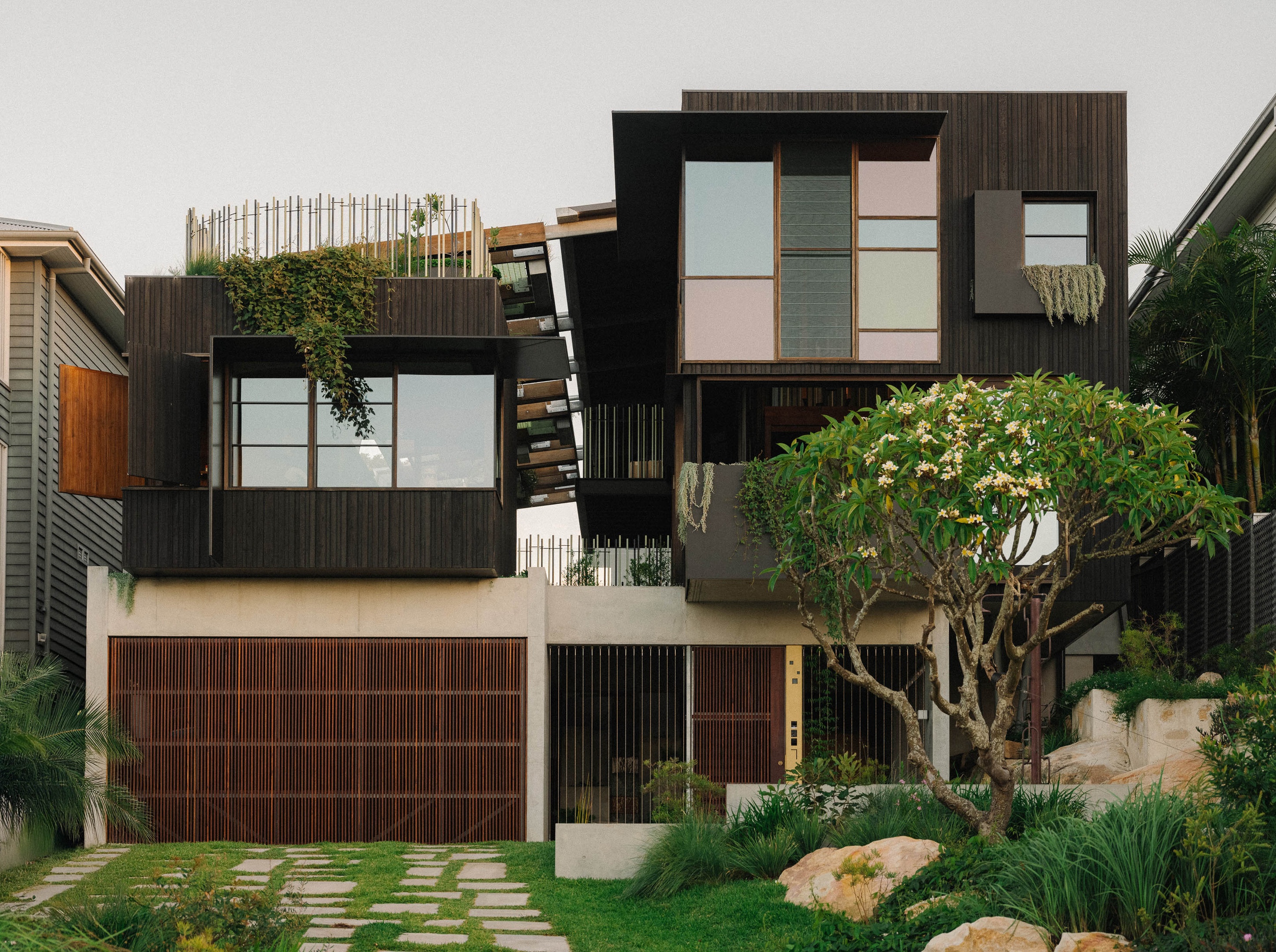 Holocene House stands out. The two-storey beachside home in Manly, Sydney, designed by C Plus Architects and Builders, pushes the boundaries of a home as we know it. From the outside, its black, box-like form is unassuming. Step inside and it feels like you’re living in a rainforest rather than a suburban block. Rooms open to a creek-like freshwater pool, recycled timbers line the walls, a canopy of plants flourishes