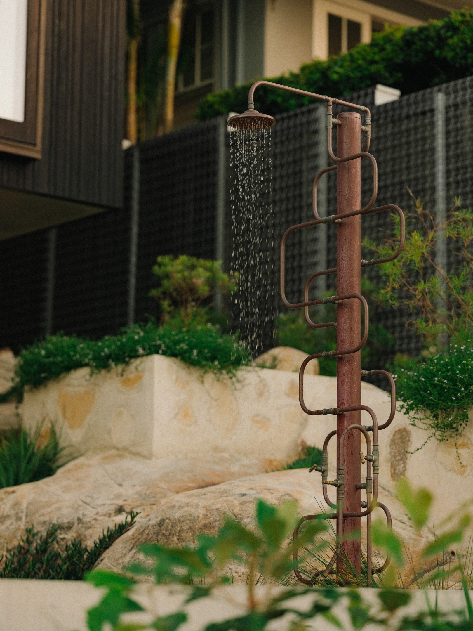 [There] are apple berry, water vine, toothed clematis, headache vine, dichondra silver falls, wombat berry, love creeper, false sarsparilla and jasmine morinda. Everything was chosen for low water needs, fed by greywater and rainwater systems, with compost from garden waste boosting soil. Some of my favourite species used are the cabbage palm, melaleuca, native fuschia and saw-toothed banksia.