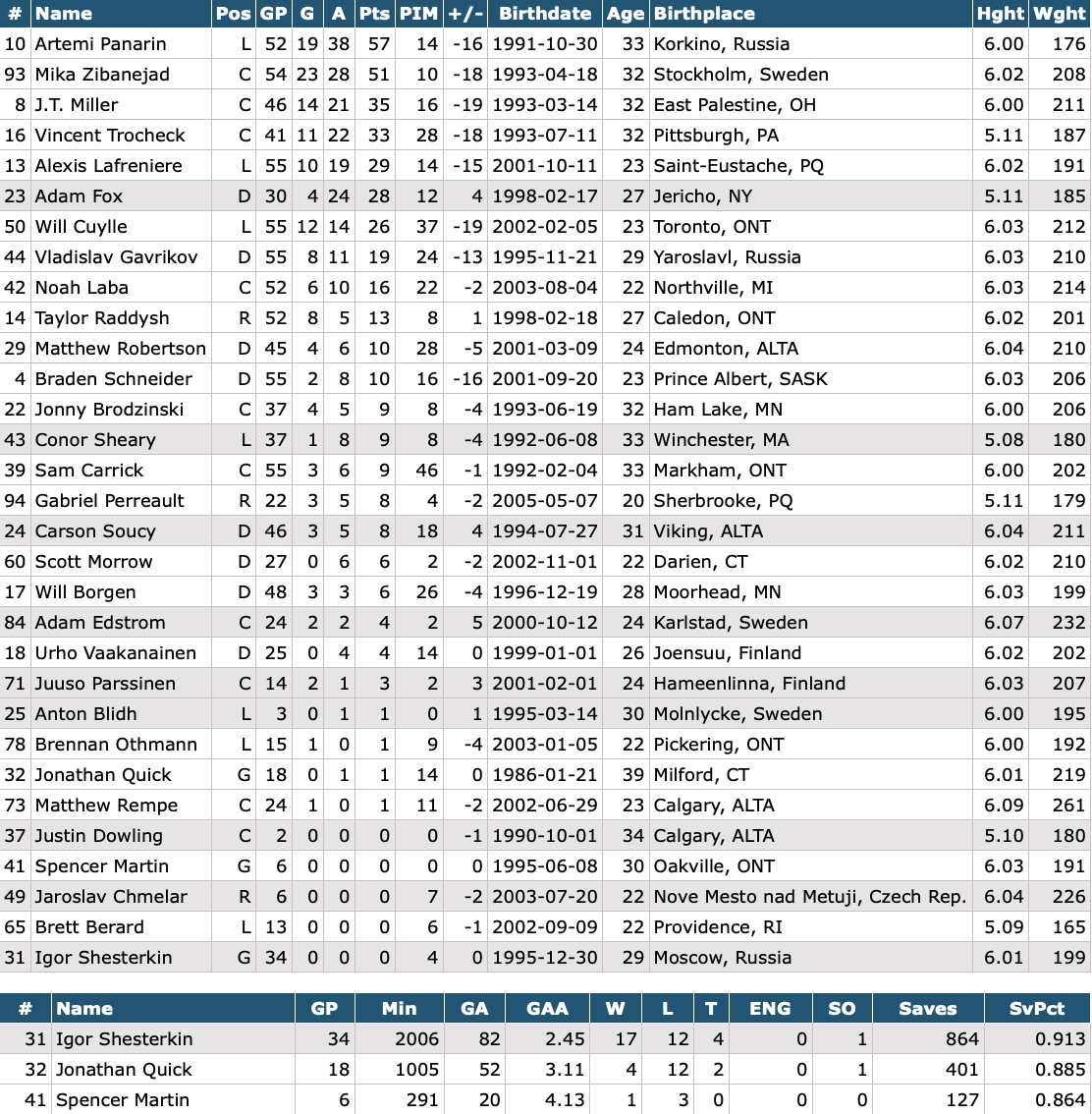 Injured Reserve: Conor Sheary, Adam Fox, Adam Edstrom, Igor Shesterkin