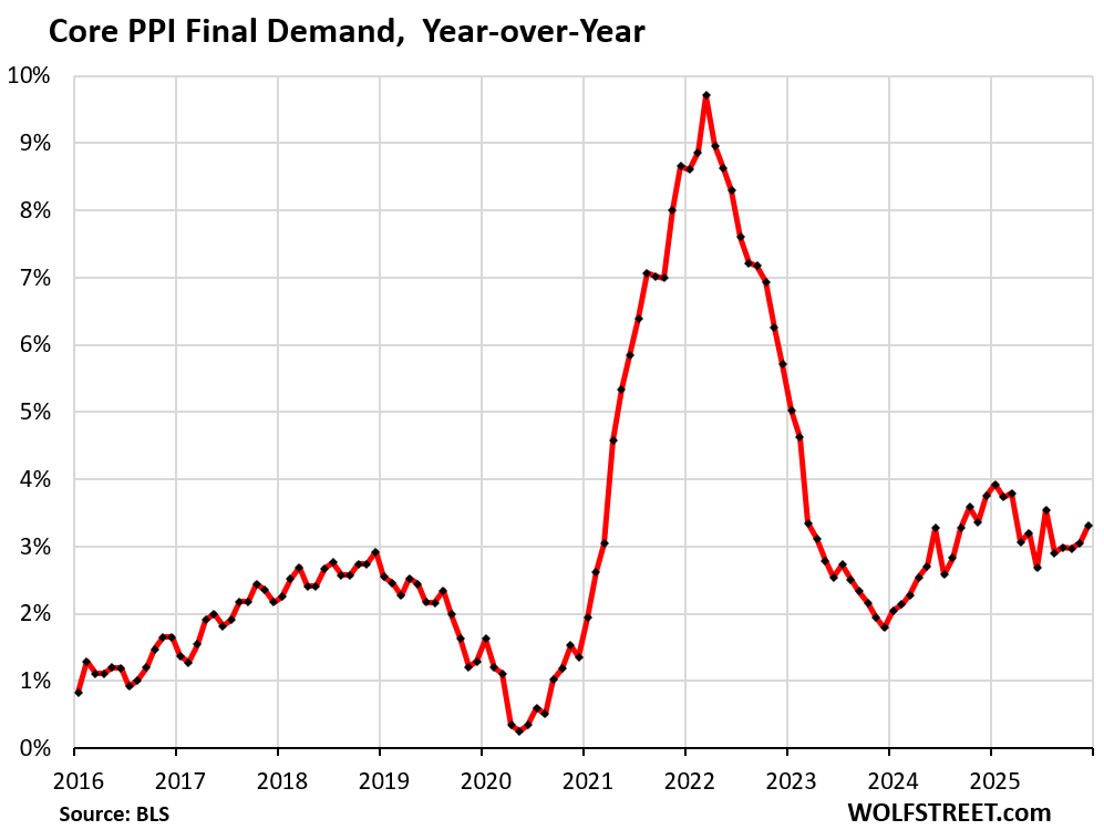 But the services PPI spiked, and services are not tariffed, and they dominate the US economy. The services PPI weighs 68% of the overall PPI. And this big increase is bad news for inflation.