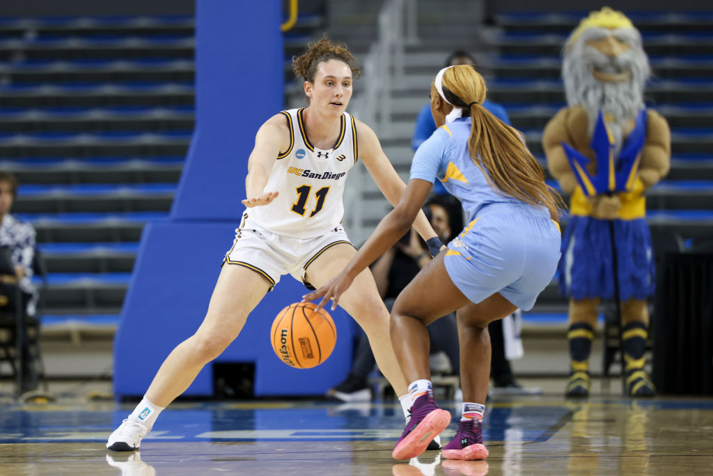 Erin Condron #11 of the UC San Diego Tritons guards Aniya Gourdine #1 of the Southern Lady Jaguars in the first half during the First Four round of the 2025 NCAA Women’s Basketball Tournament held at UCLA Pauley Pavilion on March 19, 2025 in Los Angeles, California. Photo: Jay L. Clendenin/NCAA Photos via Getty Images