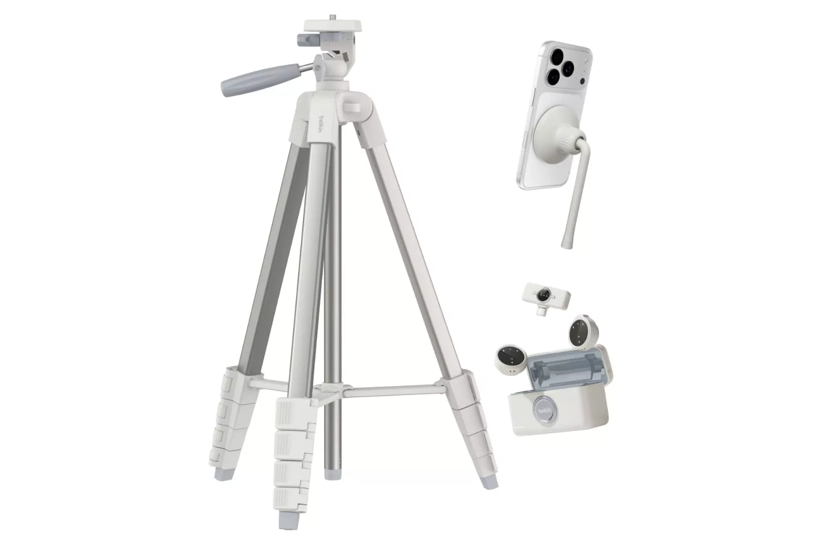While they’re not quite on the same playing field as Manfrotto or Benro legs, the Belkin equivalent is an aluminium tripod in white that comes with a magnetic phone mount on an arm able to hold a phone up from the tripod itself. The tripod folds up, comes in a small bag, and aims to be easy for people to carry, while Belkin is also including its own wireless microphone kit in the box, as well.
