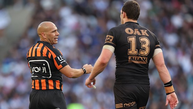 Isaah Yeo speaks to referee Ashley Klein. Getty