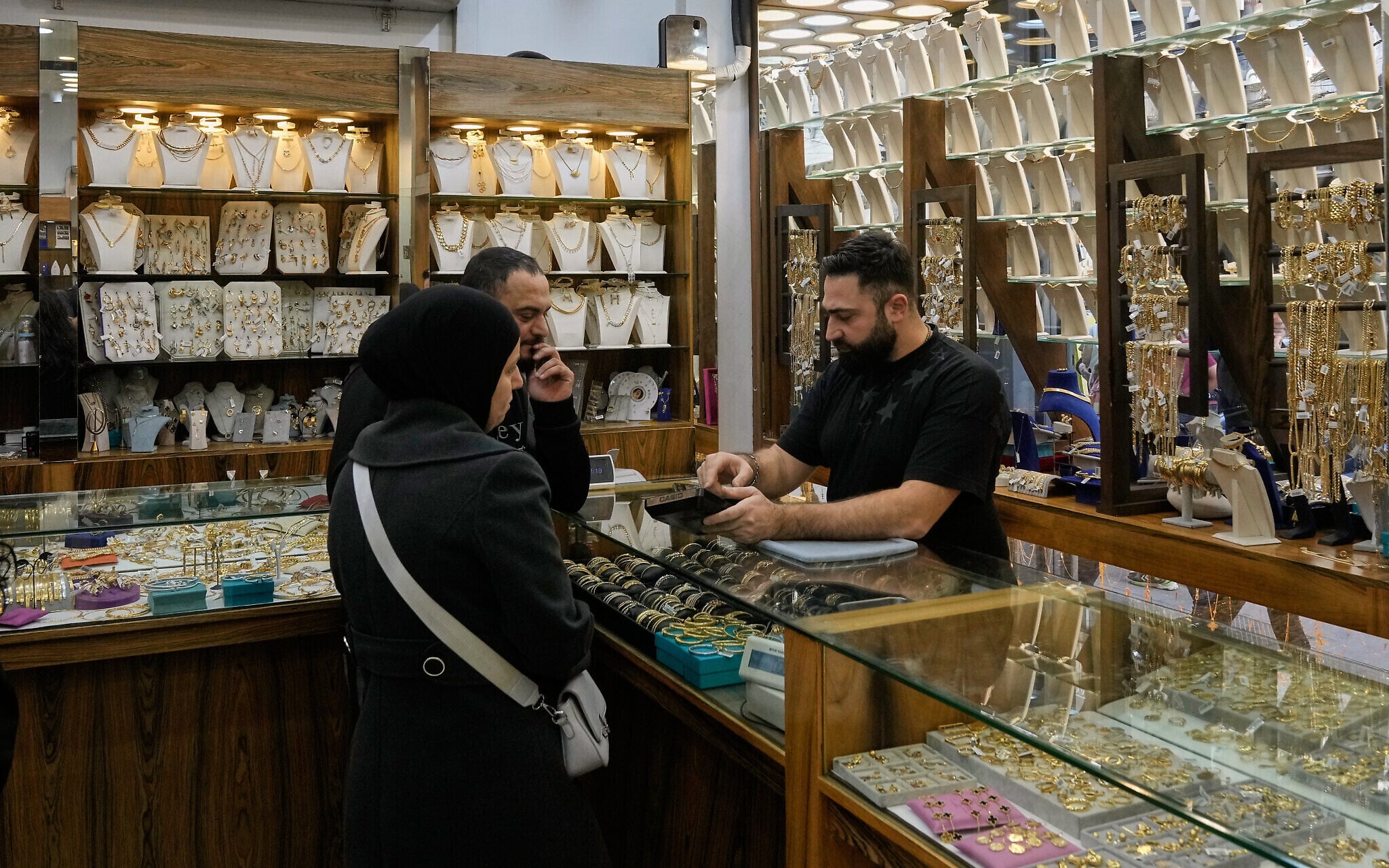 A couple checks out pieces of gold at a shop in Beirut, Lebanon, February 2, 2026. (AP Photo/Bilal Hussein)