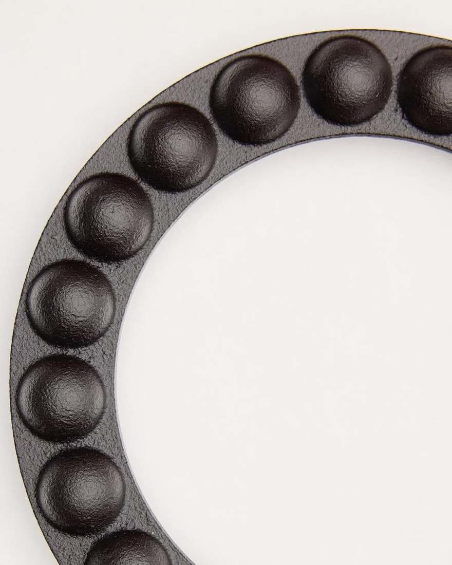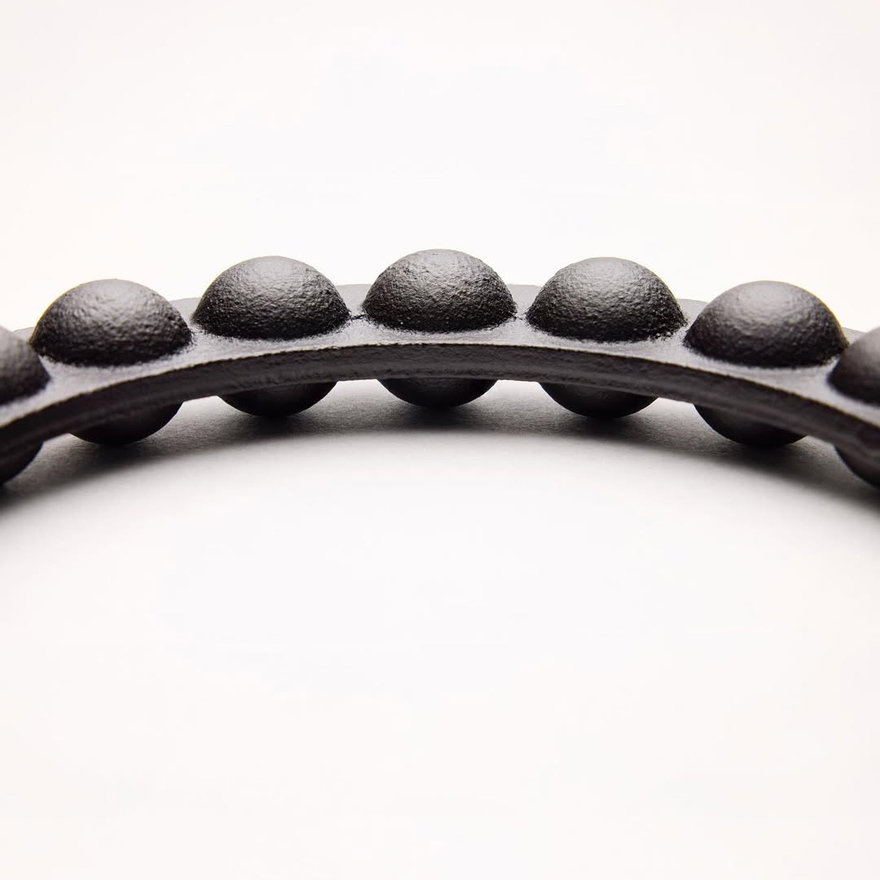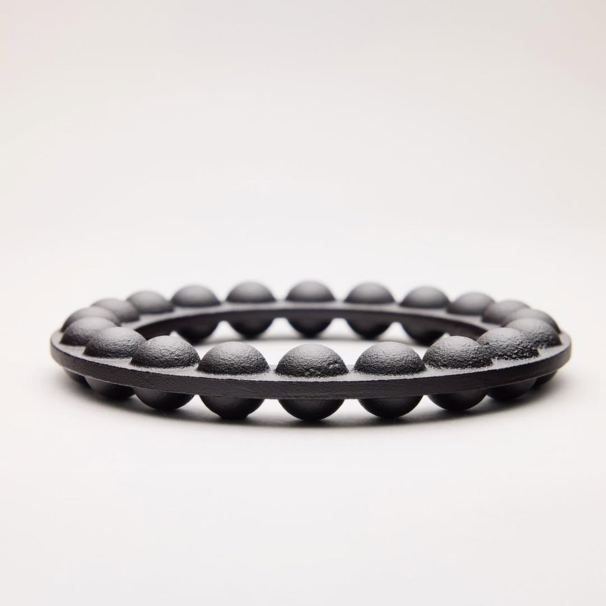 It’s made of cast iron, but possesses a form that would have been unimaginable in cast iron’s heyday, containing twenty spheres around its perimeter; the object’s name is perhaps a wink at pearl necklaces.