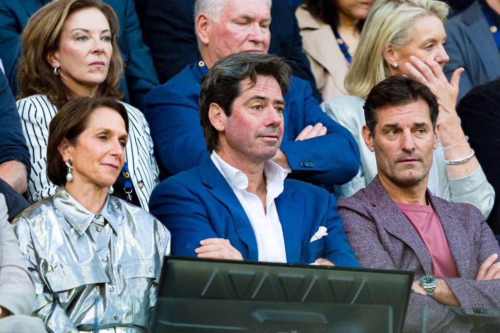 Tabcorp chief executive Gillon McLachlan (middle) watches on during a men’s singles semi-final at the 2025 Australian Open. (Photo by Andy Cheung/Getty Images)