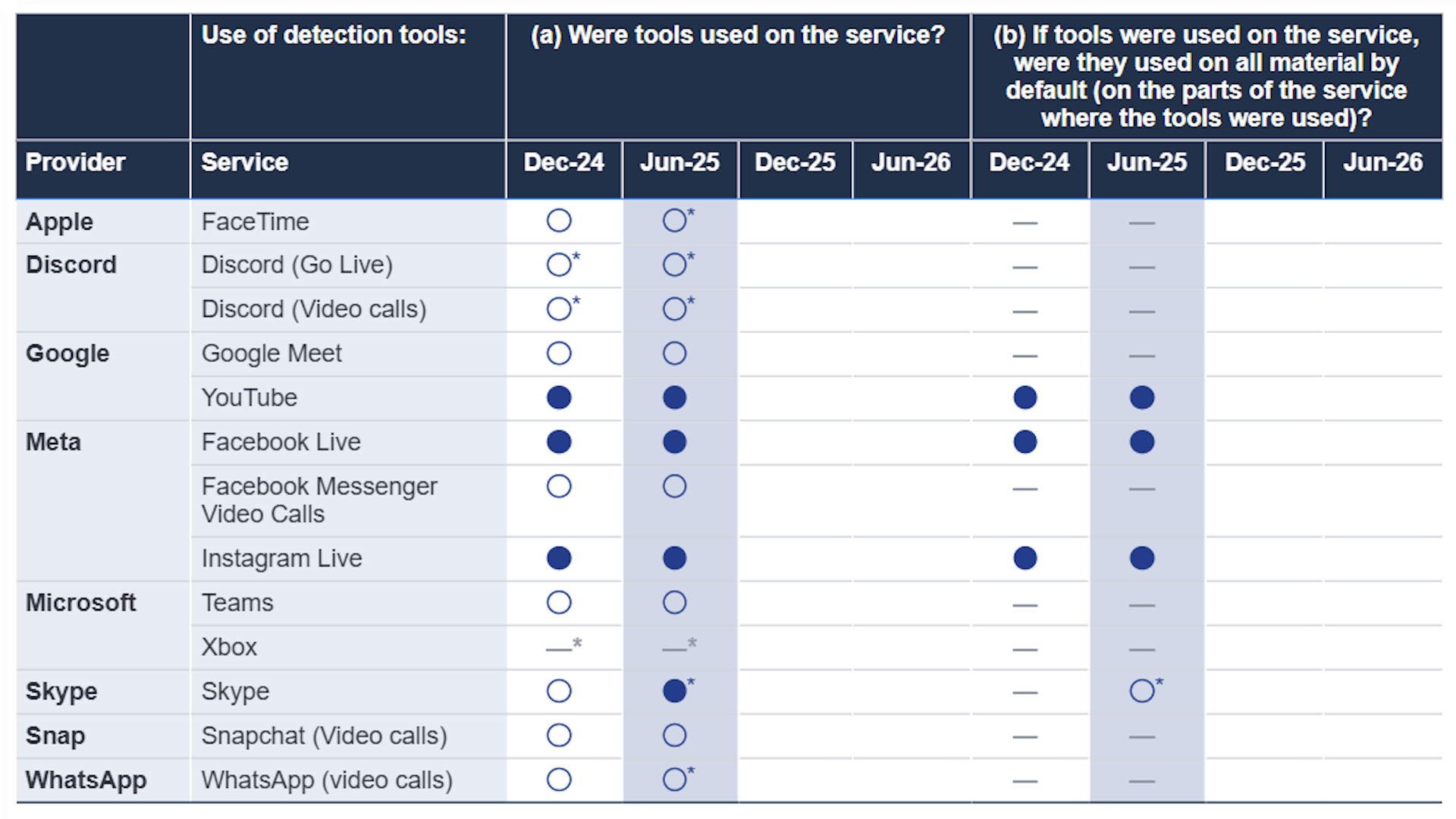The new dashboard provides an interactive summary of the transparency notices. This table shows which technology platforms are using tools to detect child abuse and exploitation within live streams. eSafety Commissioner