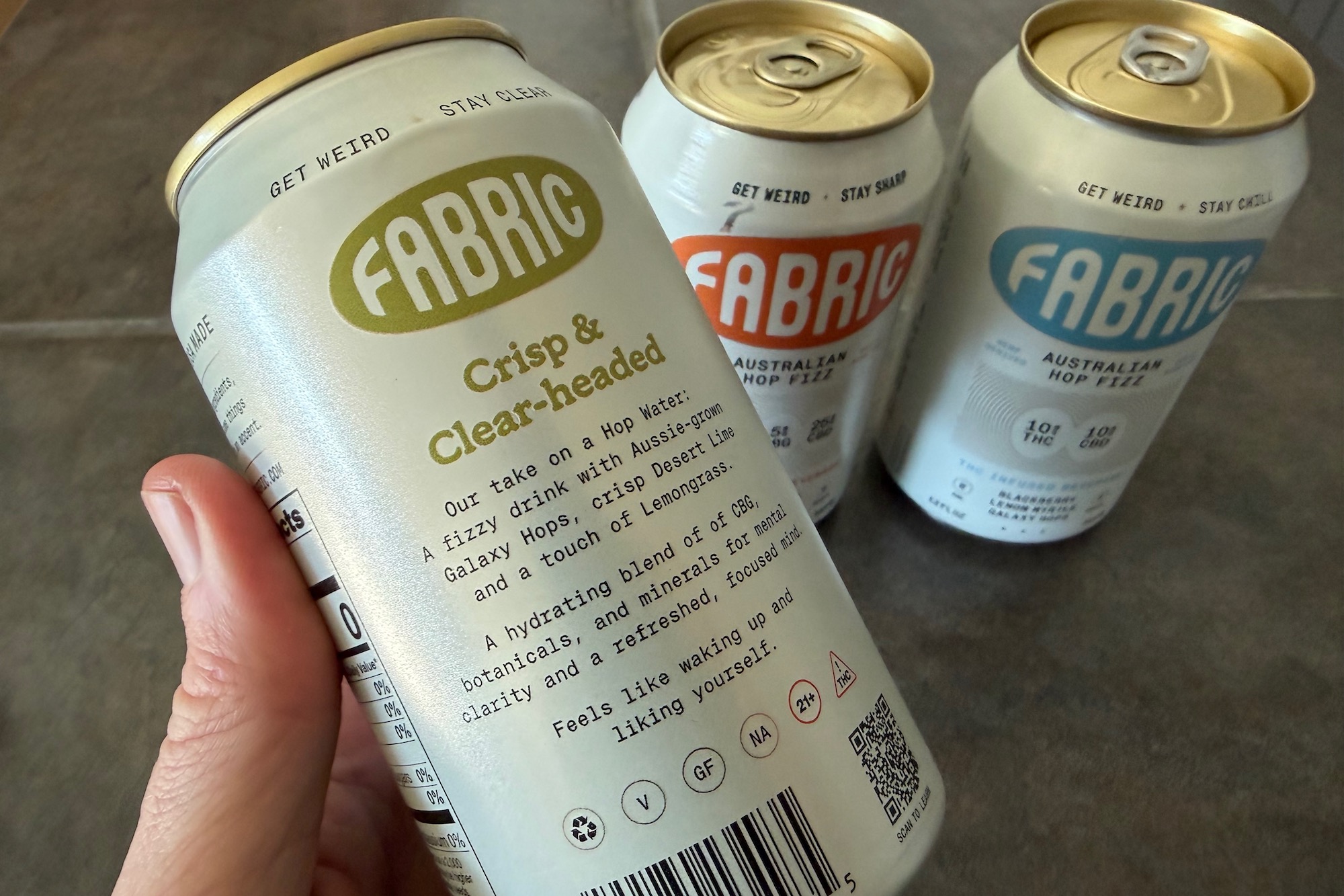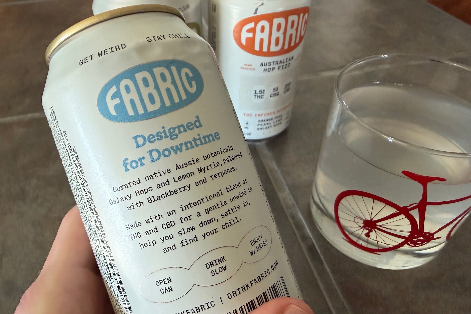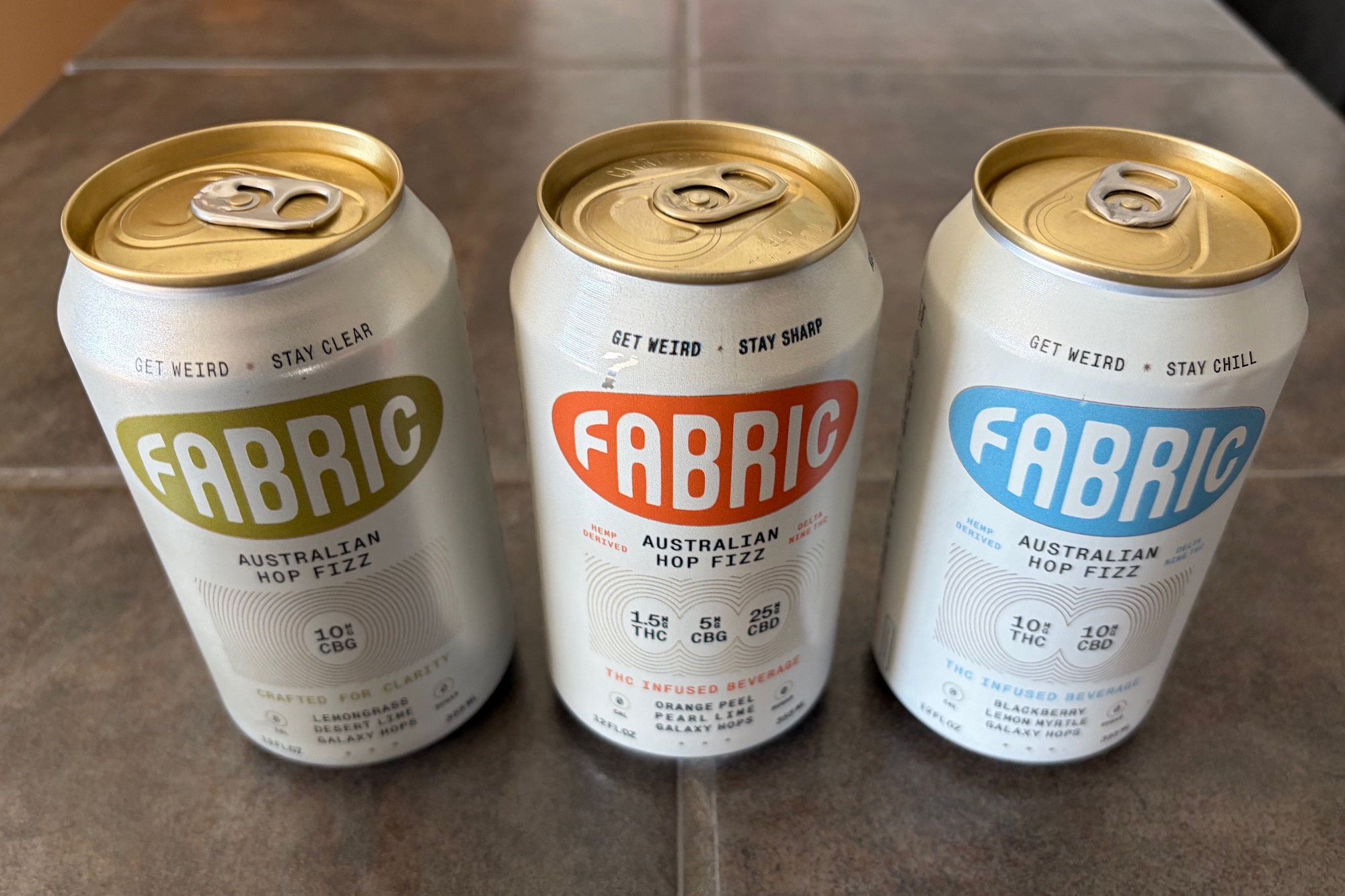 So, I decided to give them a shot. After all, Fabric makes three varieties of its Hop Fizz drinks, including “Clarity,” which has zero THC. “Rhythm” contains a super low 1.5 mg of THC, while “Downtime” steps up to 10 mg of THC. Additionally, all of them also include CBD and/or CBG, both of which are non-psychoactive cannabis derivatives typically associated with therapeutic properties. CBG is typically considered to be uplifting, while CBD is more relaxing. Regardless, each beverage is formulated to align with its name, Clarity, Rhythm, or Downtime.