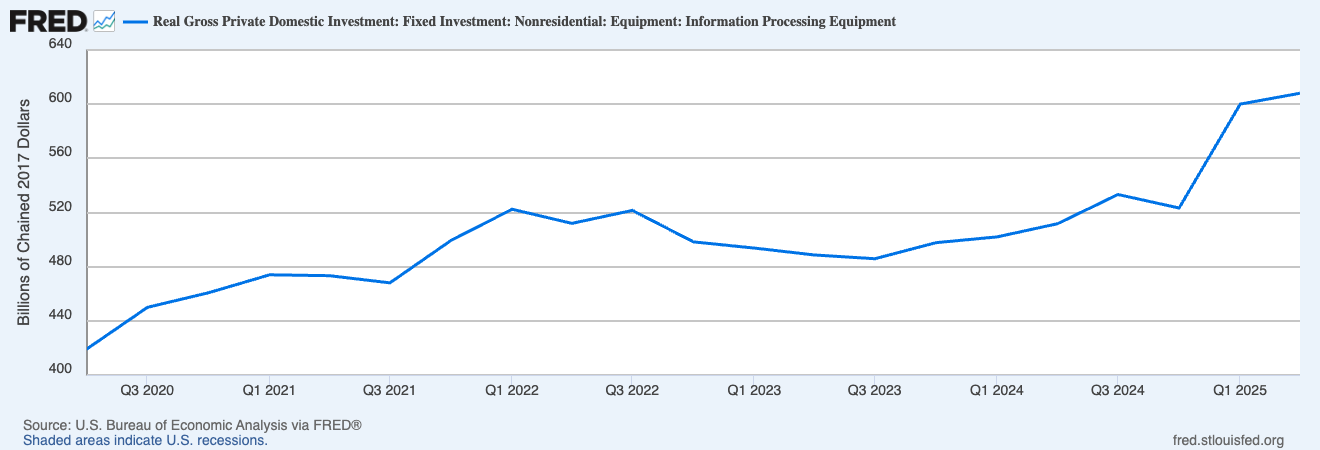 Finally, Trump isn’t the only thing driving the economy and the market right now. As I mentioned, the current market narrative is largely driven by AI. And as it happens, Trump’s economic reign of error has coincided with a huge surge in investment related to AI. Here’s real spending on information processing equipment, which basically reflects the frantic construction of data centers: