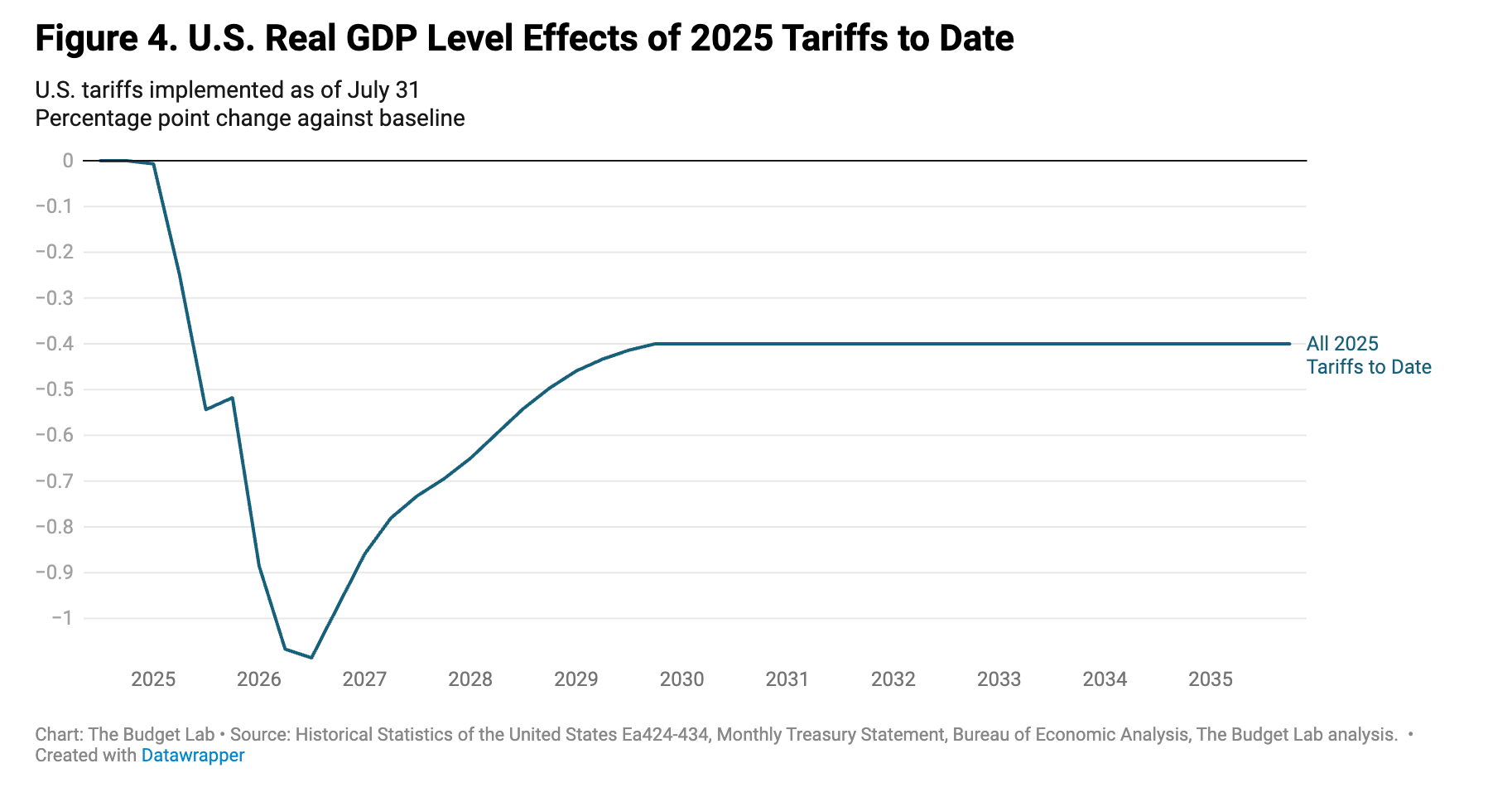 Speaking of which: While Trump’s tariffs are very bad, there is — as I wrote in Sunday’s primer — a tendency, among both economists and other observers, to exaggerate the damage done by protectionism. Uncertainty about tariffs is definitely depressing business spending in the short run, but in that primer I estimated that Smoot-Hawley 2.0 will reduce long-run U.S. real GDP by 0.4 percent. The Yale Budget Lab, with a more elaborate model, comes up with very similar numbers: