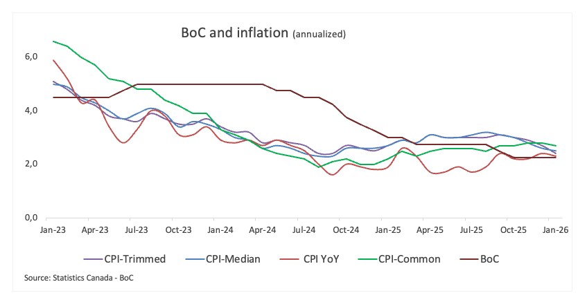 Economists see the headline CPI rising by 2.4% in a year to January, still above the BoC’s target and matching December’s increase. On a monthly basis, prices are expected to rise by 0.1%. The bank will also closely monitor its core measure (which strips food and energy costs), which held steady at 2.8% YoY in the last month of 2025.