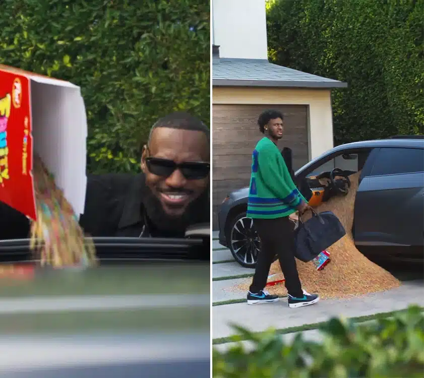 The video started with LeBron emptying a box of Fruity Pebbles from the sunroof of his son’s Lamborghini Urus before rushing to his Mercedes-Maybach to avoid being seen.