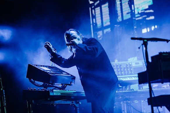 As he stands subsumed by keys and cables, Yorke’s recurring theme of man in uneasy alliance with machine is enhanced by generating and decomposing big-screen graphics, liberally enlarged and extrapolated here to fill a claustrophobic canvas. Director Dave May lets us feel the weight of it all, other embellishments limited to drone shots over an eerily still Sydney Harbour, dim-lit profiles of rapt audience members and the odd languid seagull.