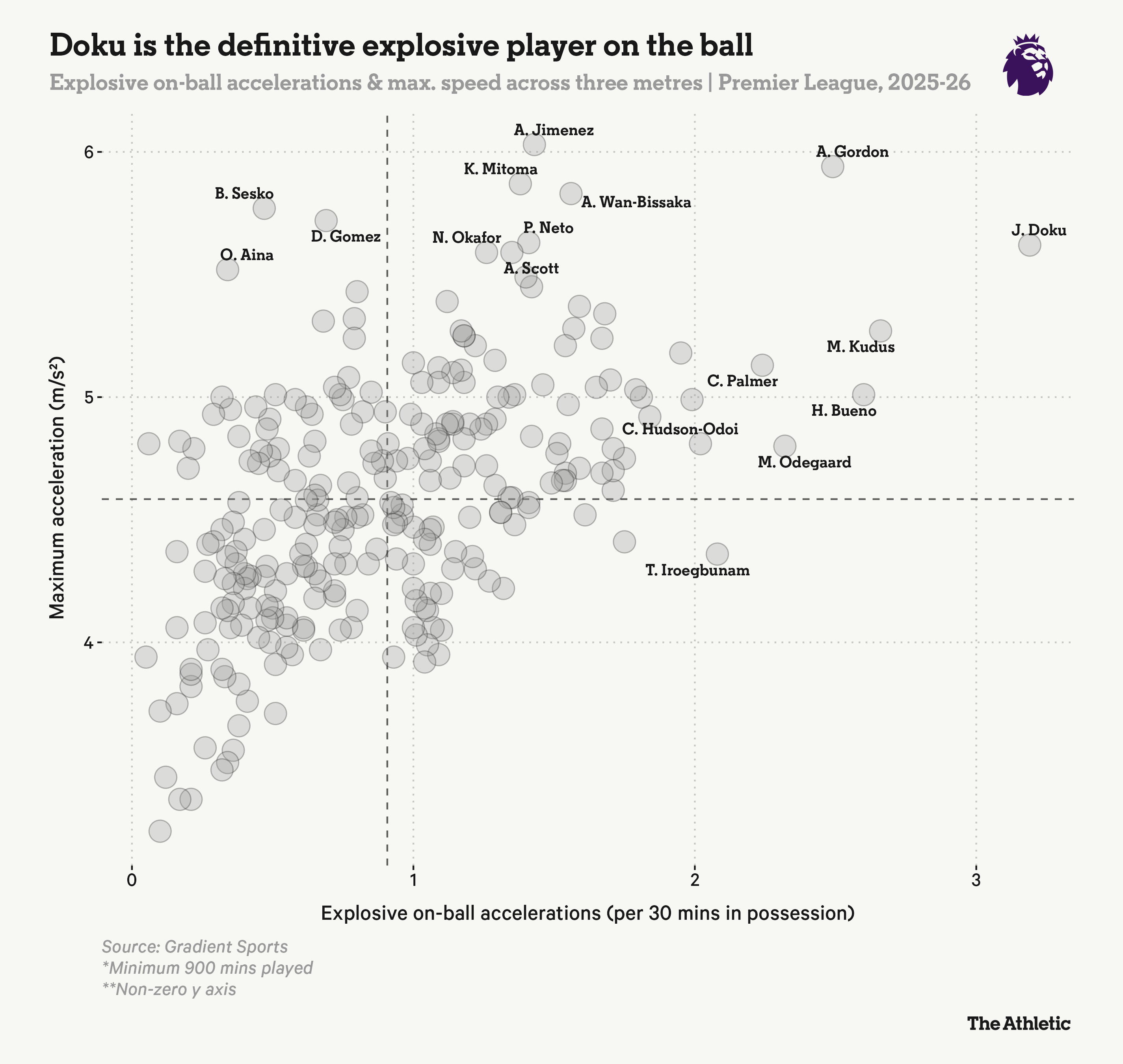 Those darting runs to unlock a defence can be crucial, and now we have a method to measure them. Using data from football analysis company Gradient Sports, we can explore a player’s explosive on-ball accelerations (denoted as an acceleration of three-plus metres per second) to see who looks to create separation from a walking pace to a sudden burst forward over three metres.