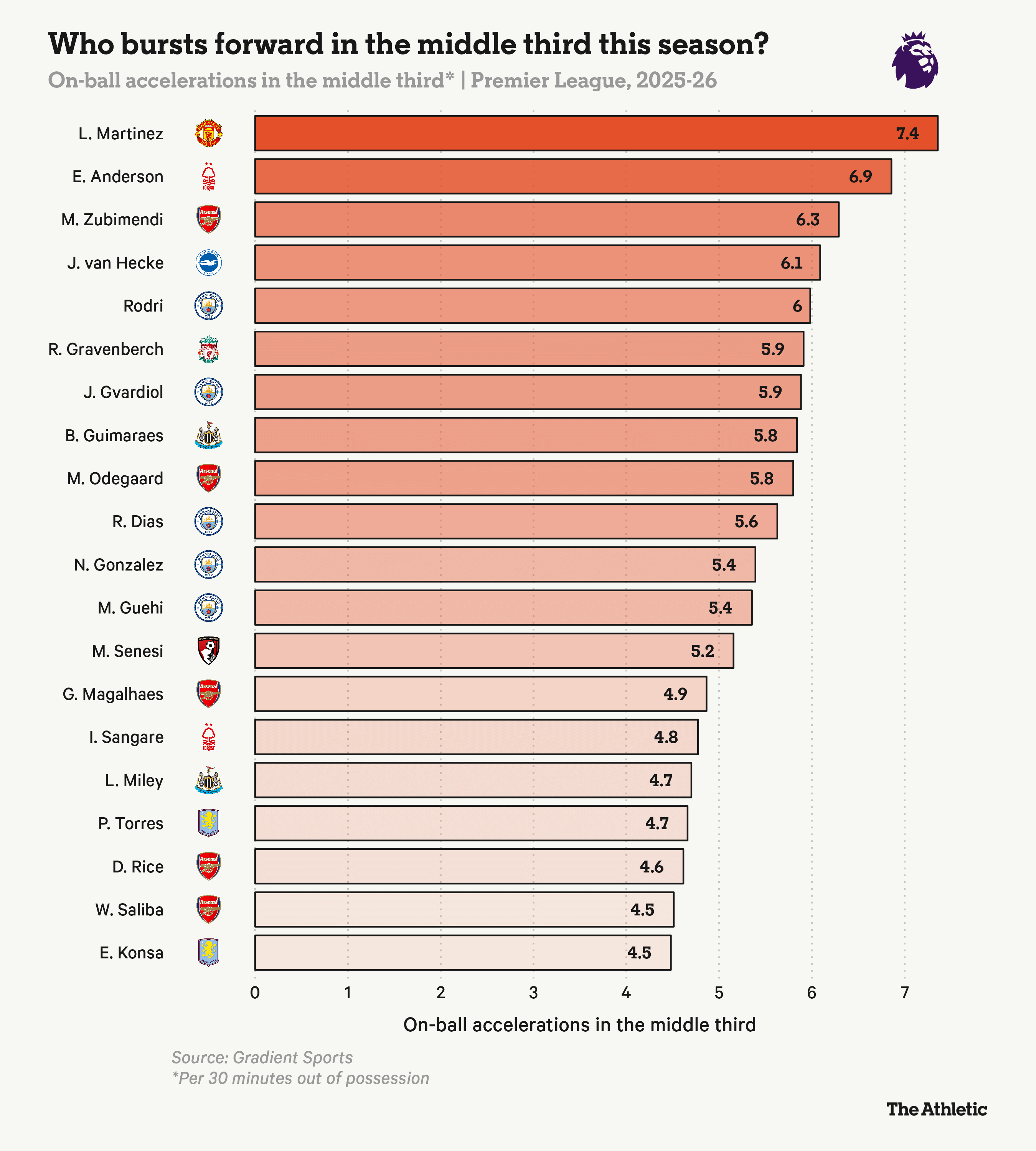 By this measure, Manchester United’s Lisandro Martinez tops the list with 7.4 on-ball accelerations in the middle third. Martinez is regularly tasked with breaking lines with a carry or pass, compared with fellow centre-backs Harry Maguire, Leny Yoro or Matthijs de Ligt. Those figures are perhaps fuelled by his minutes as a left centre-back in Ruben Amorim’s 3-4-2-1 system, where there was more licence to drive into space, but Martinez is well-regarded for his ability to get his side on the front foot.