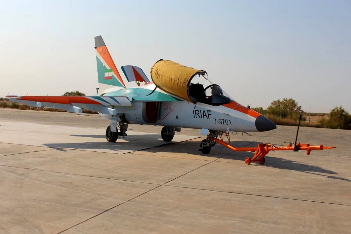 This handout picture provided by the Iranian Army office on September 2, 2023 shows a Yak-130 training aircraft at an airbase in Iran (Iranian Army office / AFP)