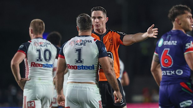 James Tedesco speaks to referee Wyatt Raymond. Â NRL Imagery