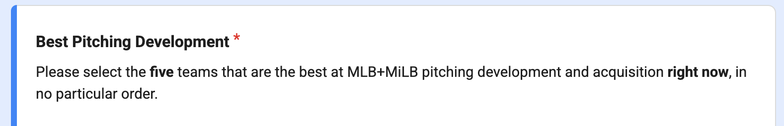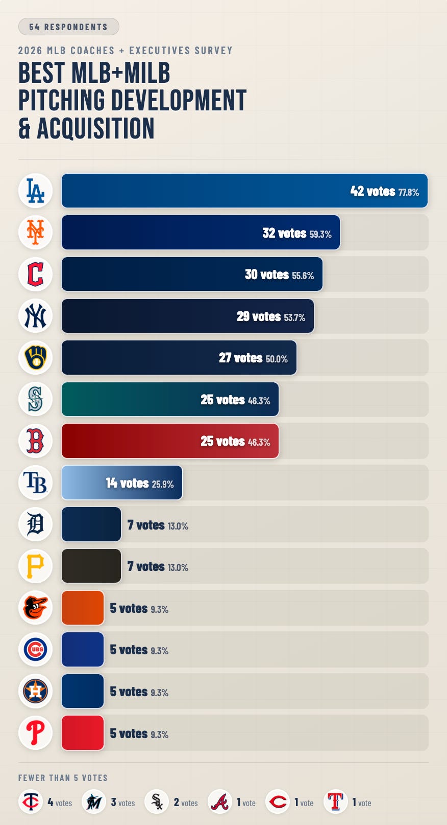 Below, I’ll show the results of the survey, followed by my tiered ranking from #1 to #30 of the best pitching development and acquisition organizations in MLB. This ranking is heavily informed by the results of the survey, with some massaging of the results based on how I interpreted responses. I’ll be releasing a YouTube video walking through the minutiae of the survey and some of the results you see below, so make sure to check that out.
