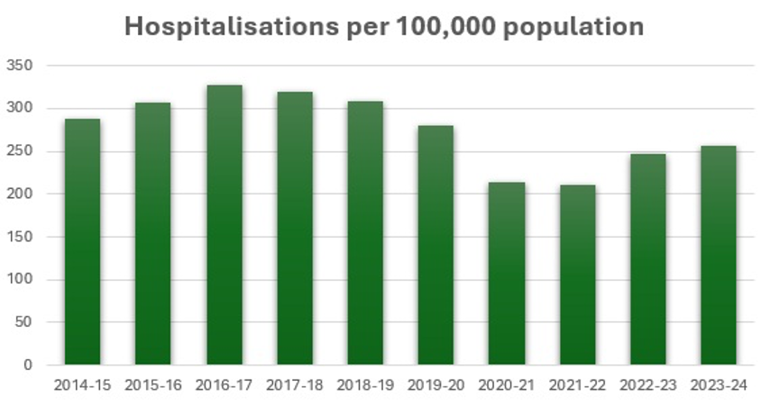 COPD represented 1.3% of all hospitalisations in 2023-24, a slight increase to 256 per 100,00 population from 2022-23 (248 per 100,000). Despite the current uptick, hospitalisations are still lower than they were in the years before covid.