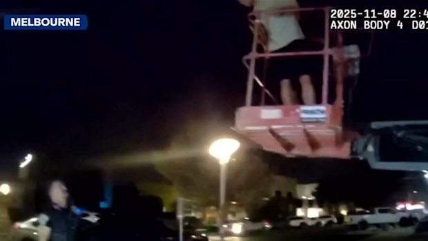 In the vision, police on bicycles approach the players as they climb into the cage of a scissor lift in a car park.