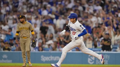 Shohei Ohtani of the Los Angeles Dodgers running the bases after hitting a single against the San Diego Padres. Photo Credit to Jayne Kamin-Imagn Images.