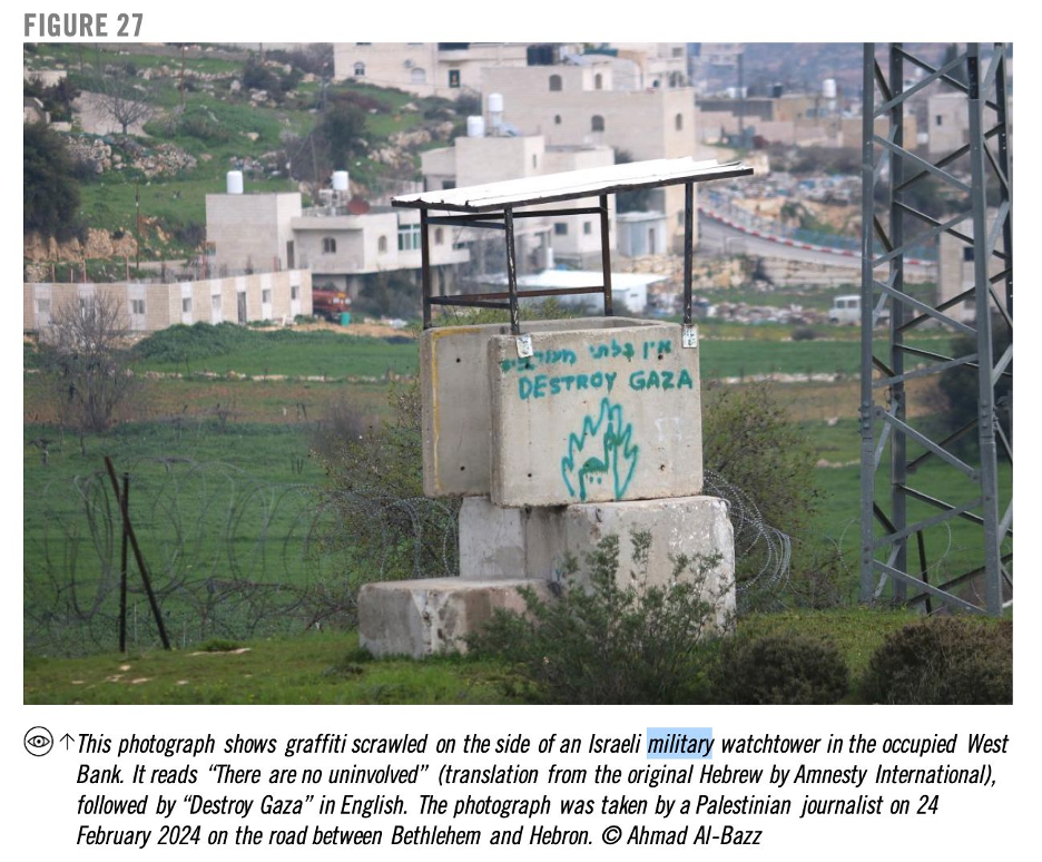 Contrary to Sidoti’s claim that there was graffiti repeating the “no uninvolved civilians” claim on “Palestinian buildings in Gaza,” the footnote in the Commission of Inquiry report takes you to a 2024 Amnesty International report which actually shows an Israeli military watchtower in the West Bank.