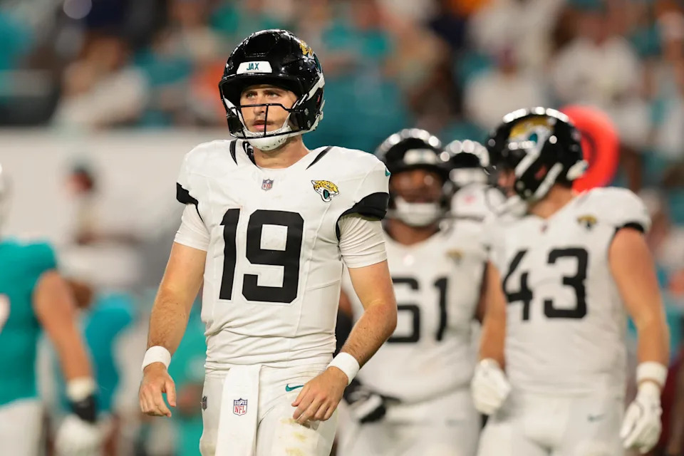Aug 23, 2025; Miami Gardens, Florida, USA; Jacksonville Jaguars quarterback Seth Henigan (19) walks toward the sideline against the Miami Dolphins during the fourth quarter at Hard Rock Stadium. Mandatory Credit: Sam Navarro-Imagn Images