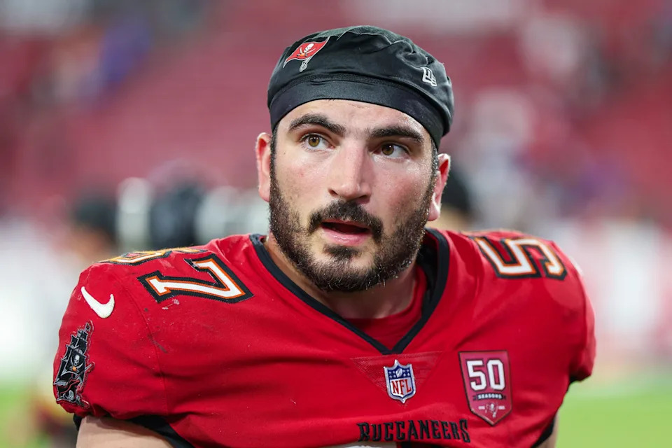Aug 9, 2025; Tampa, Florida, USA; Tampa Bay Buccaneers linebacker John Bullock (57) looks on after a preseason game against the Tennessee Titans at Raymond James Stadium. Mandatory Credit: Nathan Ray Seebeck-Imagn Images