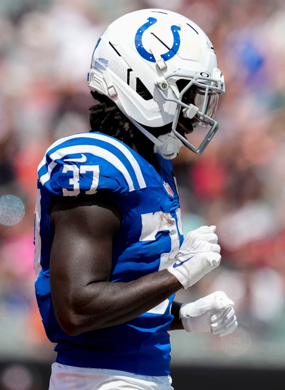 INDIANAPOLIS, INDIANA – SEPTEMBER 22: Jaylon Jones #40 of the Indianapolis Colts reacts during the first half of the game against the Chicago Bears at Lucas Oil Stadium on September 22, 2024 in Indianapolis, Indiana. (Photo by Michael Hickey/Getty Images)