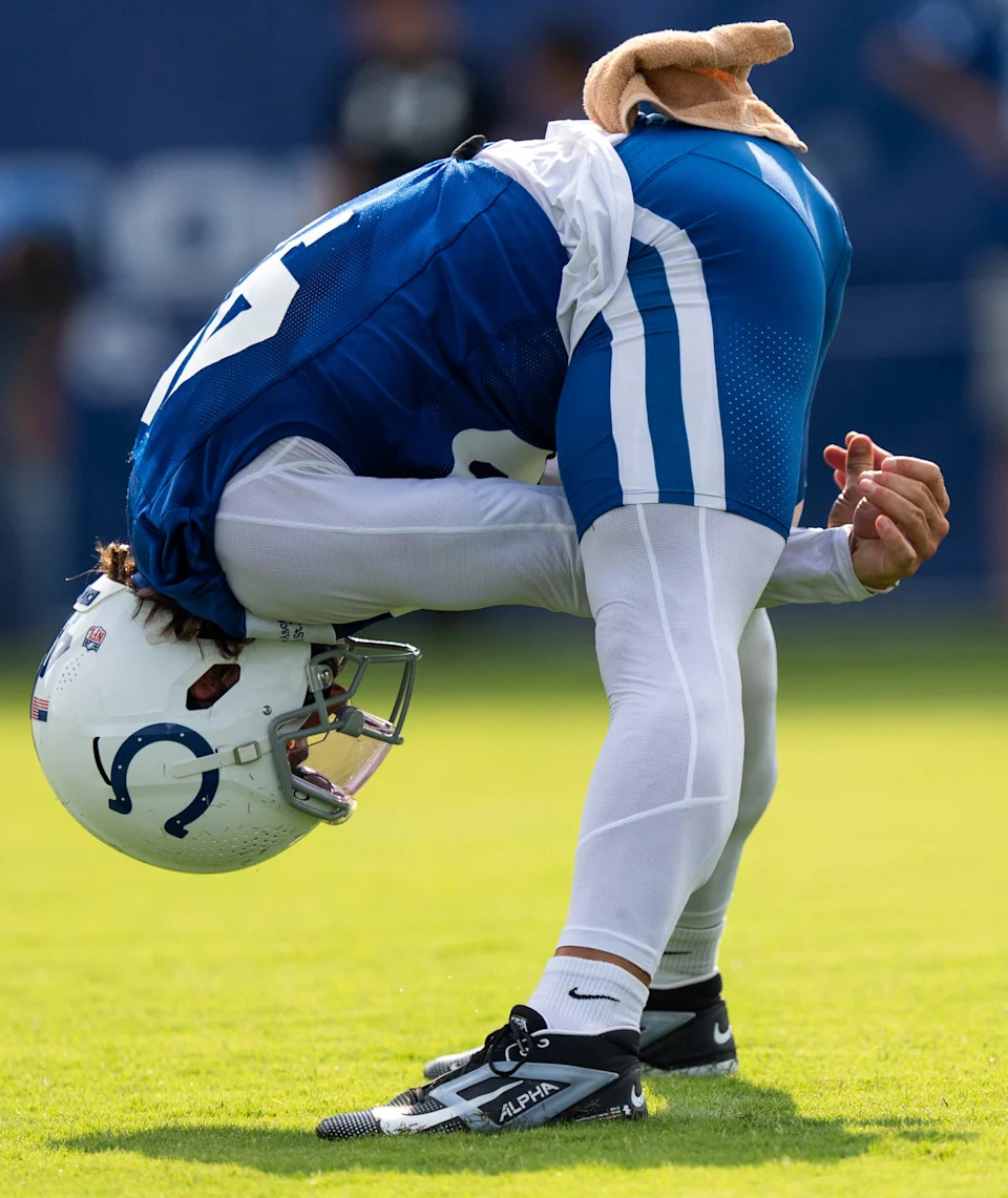 Indianapolis Colts place kicker Spencer Shrader (3) kicks Friday, July 25, 2025, during training camp held at Grand Park in Westfield.