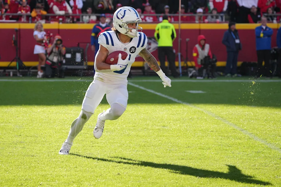 Nov 23, 2025; Kansas City, Missouri, USA; Indianapolis Colts wide receiver Anthony Gould (6) runs against the Kansas City Chiefs in the second half at GEHA Field at Arrowhead Stadium. Mandatory Credit: Denny Medley-Imagn Images