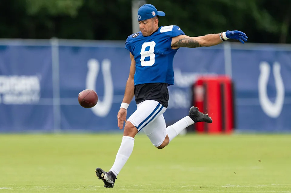 Indianapolis Colts punter Rigoberto Sanchez (8) kicks the ball Monday, July 28, 2025, during training camp held at Grand Park in Westfield.