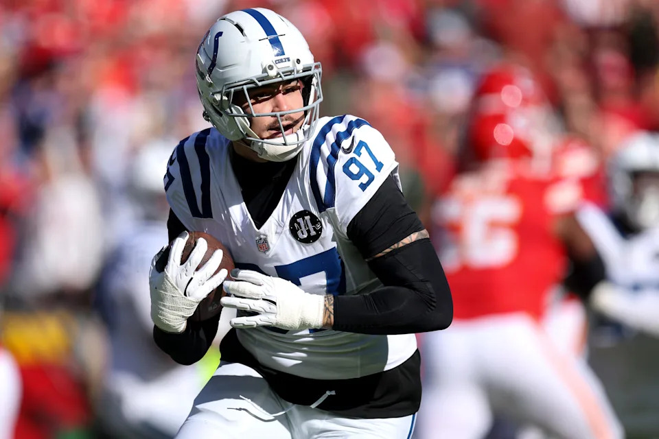 KANSAS CITY, MISSOURI – NOVEMBER 23: Laiatu Latu #97 of the Indianapolis Colts intercepts a pass made by Patrick Mahomes #15 of the Kansas City Chiefs (not pictured) in the first quarter of the game at Arrowhead Stadium on November 23, 2025 in Kansas City, Missouri. (Photo by Jamie Squire/Getty Images)