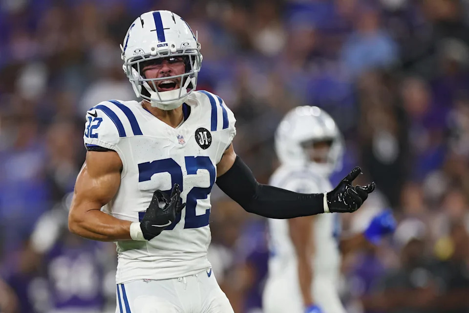 BALTIMORE, MARYLAND – AUGUST 07: Safety Daniel Scott #32 of the Indianapolis Colts reacts against the Baltimore Ravens in the second half during the NFL Preseason 2025 game between Indianapolis Colts and Baltimore Ravens at M&T Bank Stadium on August 7, 2025 in Baltimore, Maryland. (Photo by Patrick Smith/Getty Images)