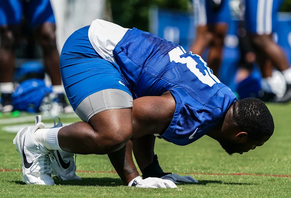 Indianapolis Colts player Tim Smith (93) stretches during training Camp at Grand Park on Saturday, July 26, 2025, in Westfield, Ind.