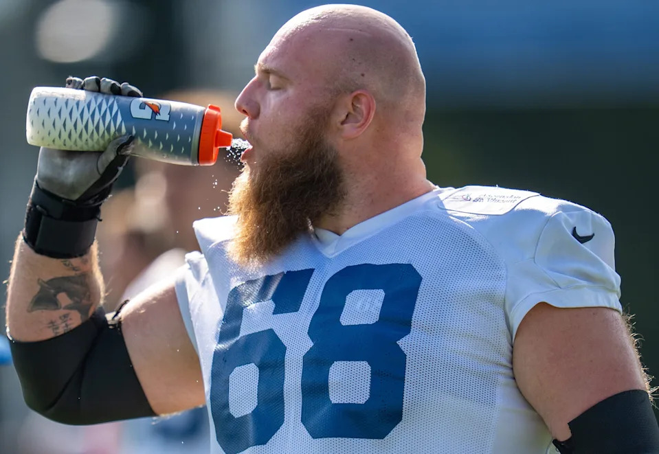 Indianapolis Colts guard Dalton Tucker (68) gets a drink of water Thursday, July 24, 2025, during training camp held at Grand Park in Westfield.