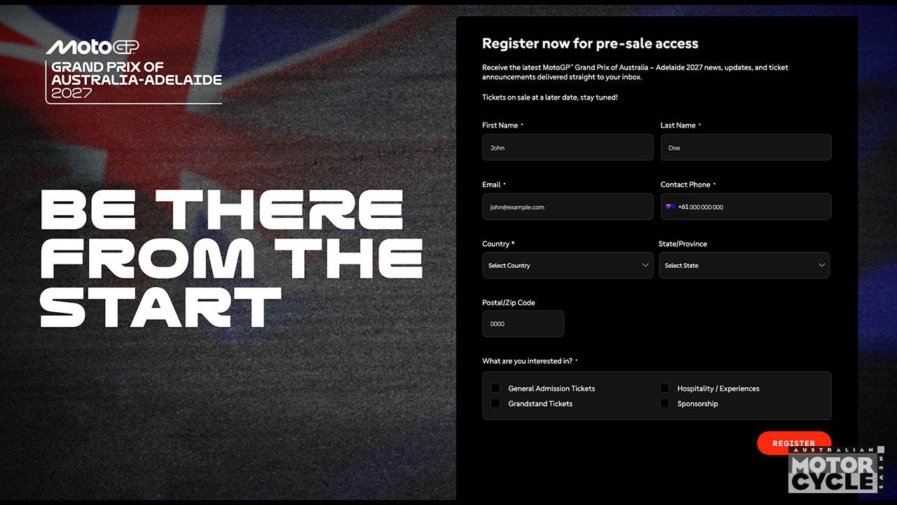 Ticket interest registration is now open for the 2027 MotoGP™ Grand Prix of Australia on the Adelaide Street Circuit, with the South Australian Government launching a new website, motogpadl.com.au, to collect expressions of interest across general admission, grandstand and hospitality packages.