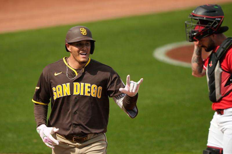 San Diego Padres’ Manny MacHado celebrates a two-run double past Cincinnati Reds catcher Will Banfield during the third inning of a spring baseball game in Goodyear, Ariz., Thursday, Feb. 26, 2026. (AP Photo/Chris Carlson)