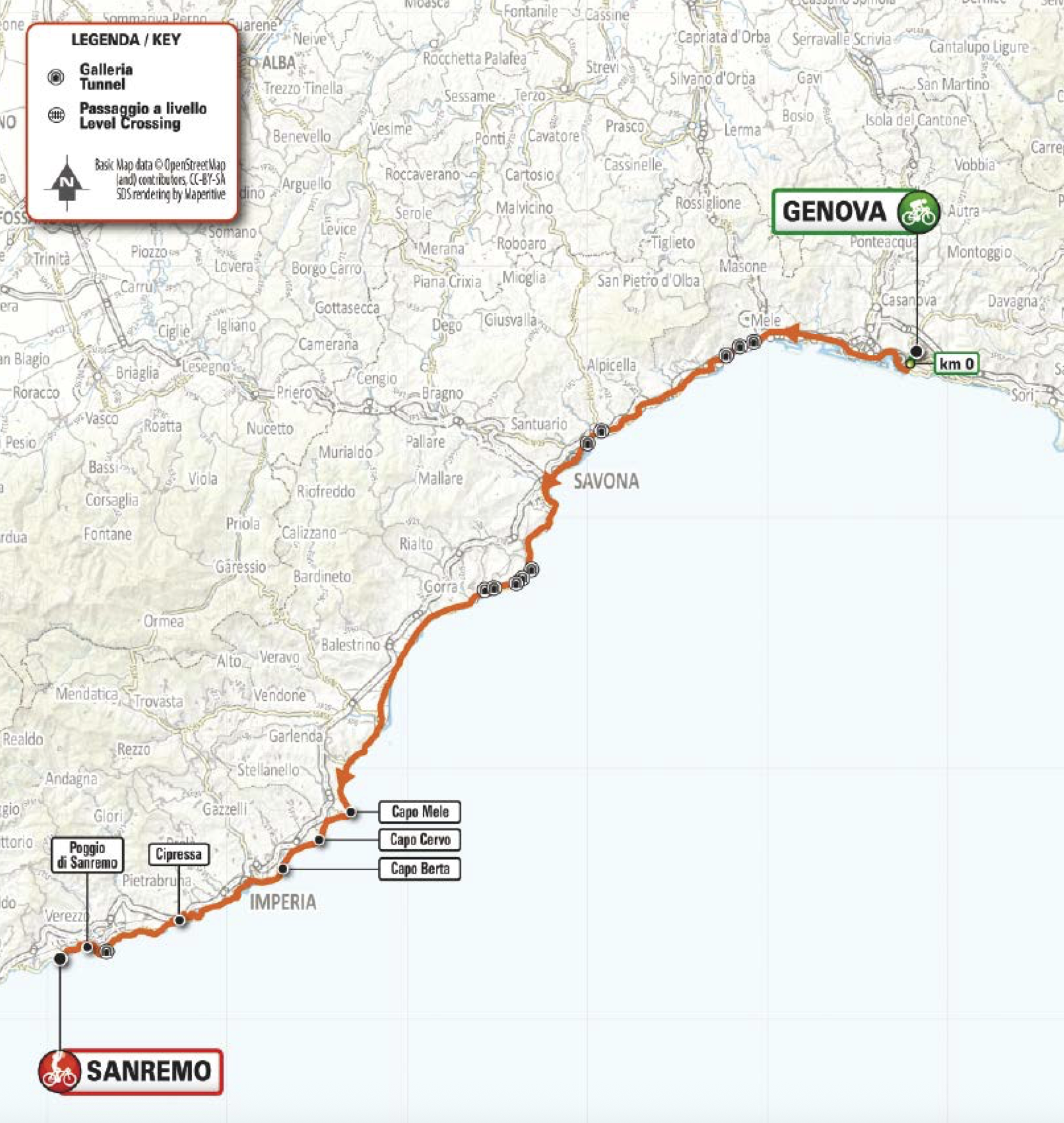 At only 156 km, the women’s route lacks the length that defines the men’s event. The men’s race is 300 km and lasts the majority of the day, and although the women’s race is on the same roads as the men’s, they join the course only in Genoa, where the women roll out.