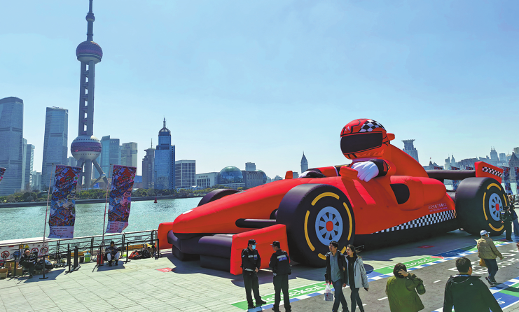 A giant model of a racing car is seen on the bank of the Huangpu River in Shanghai. TANG YANJUN/CHINA NEWS SERVICE